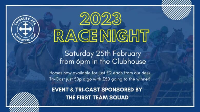 Guiseley AFC Supporters’ Club’s popular Race Night takes place on Saturday 25th February after our home game with Radcliffe.Â