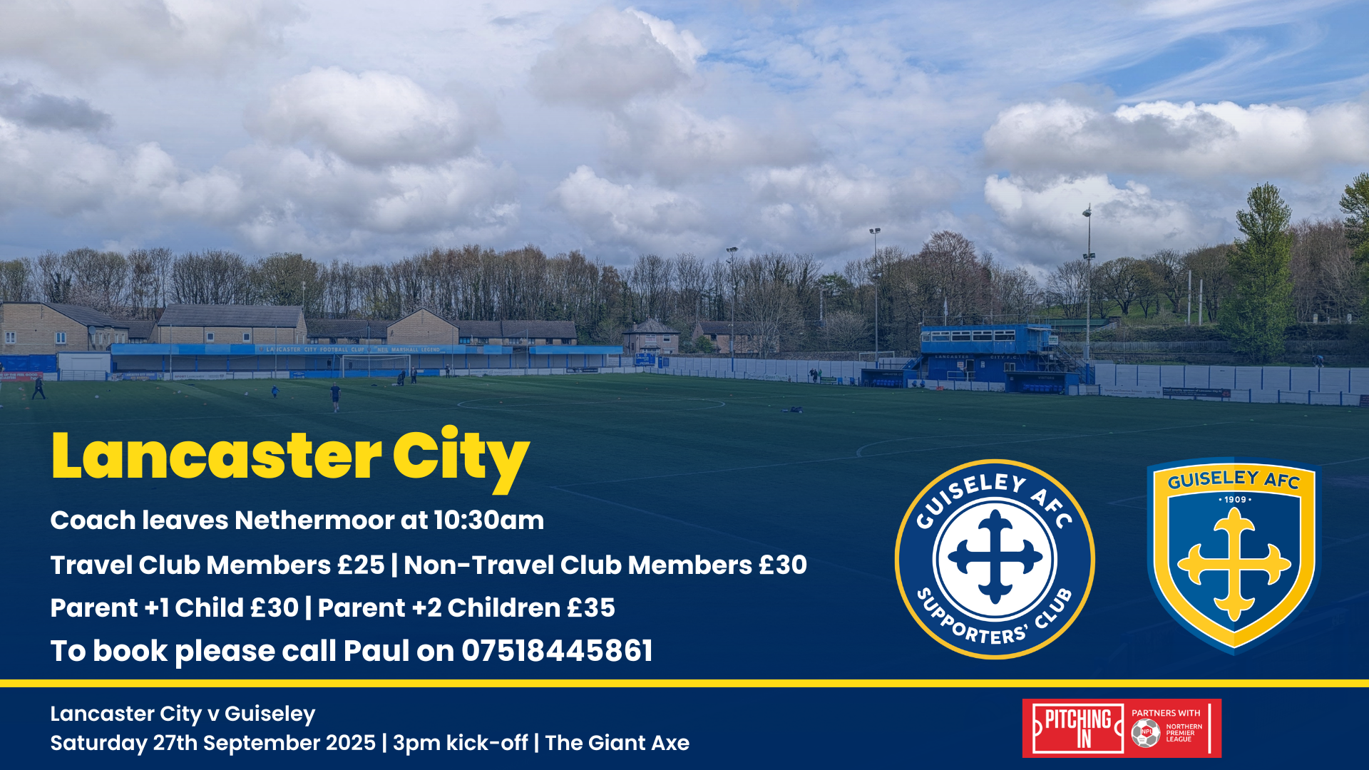 Coach travel is available with Guiseley AFC Supporters’ Club, just call Paul on 07518 445861 to secure a seat.