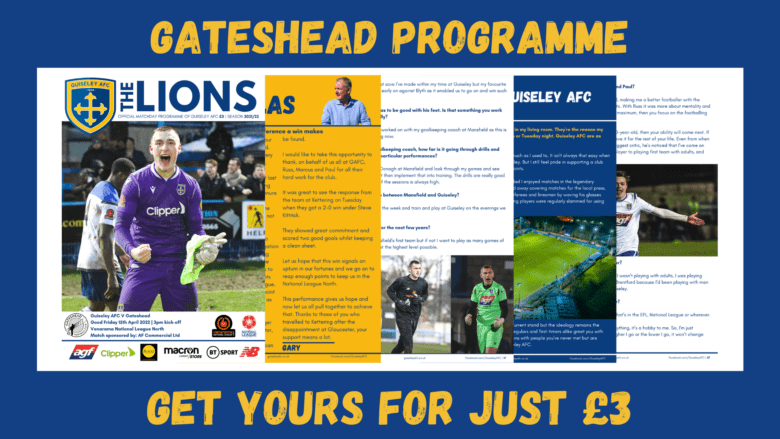 The 16th issue of The Lions matchday programme covering our match with Gateshead will be on sale on Saturday for